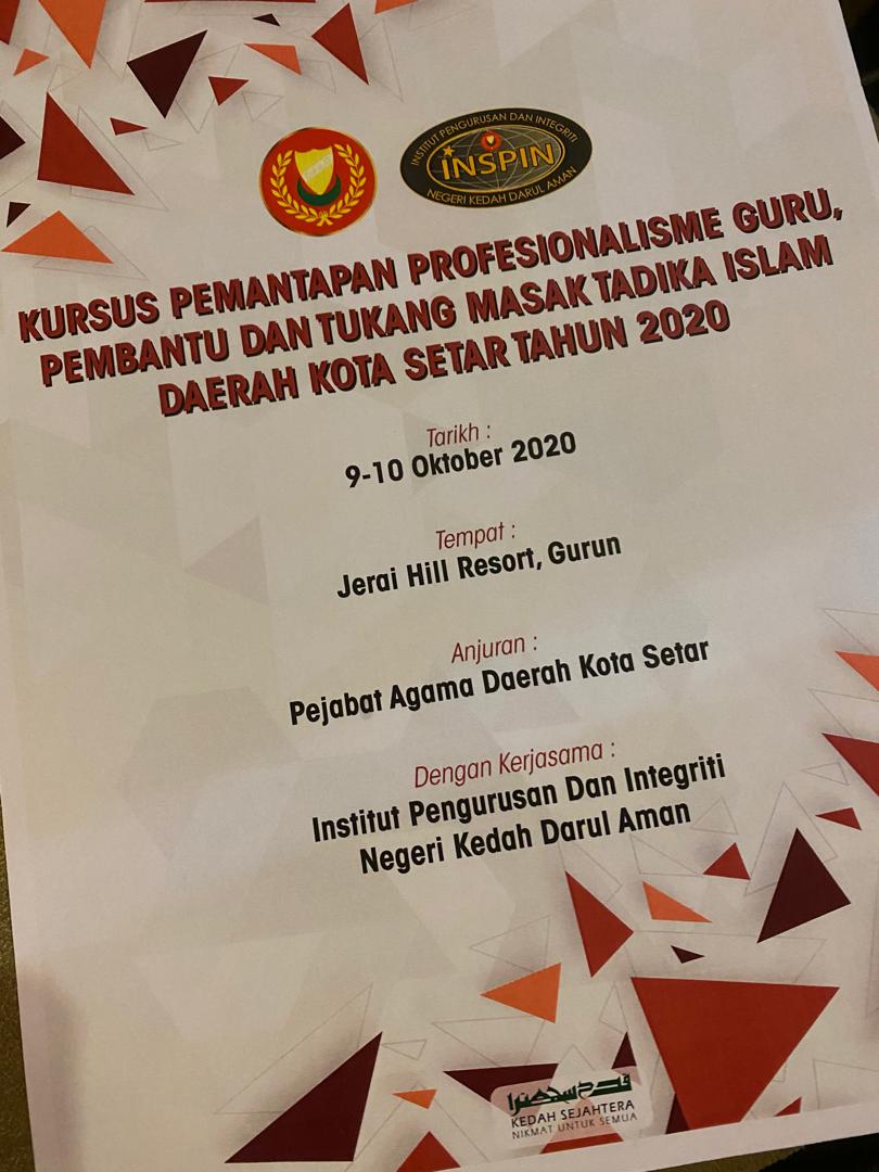 Kursus Pemantapan Profesionalisme Tadika Islam Daerah Kota Setar Tahun 2020 anjuran Pejabat Agama Daerah Kota Setar dengan kerjasama Institut Pengurusan dan Integriti Negeri Kedah Darul Aman (INSPIN) telah diadakan di The Jerai Hill Resort, Gurun pada 9 dan 10 Oktober 2020 melibatkan 40 orang peserta yang terdiri daripada Guru Besar, Guru, Pembantu dan Tukang Masak Tadika Islam dari 8 buah pusat Tadika Islam seluruh Daerah Kota Setar.